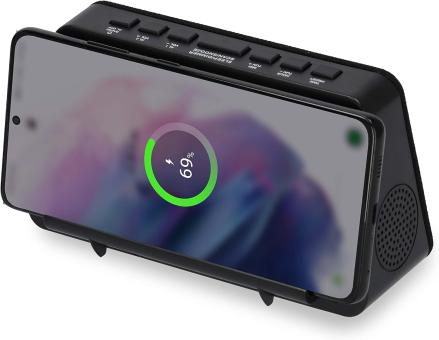 - Die AIC-Designer haben dem AIC 30 eigens eine passende Halterung für Mobiltelefone spendiert, die zum Einen sehr gut zugänglich ist, gleichzeitig aber den Blick auf das hochwertige weiße LED Display während des Ladens zulässt – clever! Zum Laden eines zweiten Gerätes, wie z.B. einer Smartwatch, steht ein praktischer USB-Port zur Verfügung. Für entspanntes Aufwachen verfügt der AIC 30 Radiowecker über Dual-Alarm. Und wer seinen Lieblingssender dabei hören möchte, ist mit der UKW-Radiofunktion mit 10 Sender-Speicherplätzen bestens bedient. Das weiße LED-Display lässt sich komfortabel in drei Stufen dimmen.