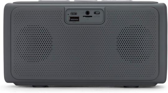 - Rückseite mit Anschlüsse: USB, microSD, AUX in Ladeanschluss des Geräts.