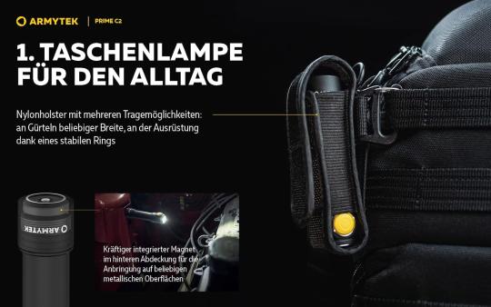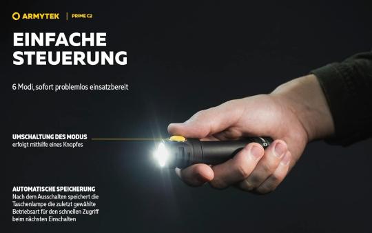 - Die Prime C2 ist eine Taschenlampe für alle, die in der täglichen Anwendung grundlegende Betriebsarten nutzen. Optimale Helligkeit, intuitiv verständliche Bedienung und mitgeliefertes sowie optionales Zubehör machen die neue Prime-Serie zu einer unverzichtbaren Haupt- oder zusätzlichen Lichtquelle bei Abendspaziergängen, Campingausflügen oder zu Hause.
