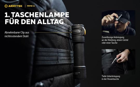 - Clip: Der abnehmbare Clip aus nichtrostendem Stahl gewährleistet die zuverlässige Anbringung an der Kleidung, einem Gürtel oder einer Tasche, außerdem lässt sich die Lampe tief in die Hosentasche stecken.