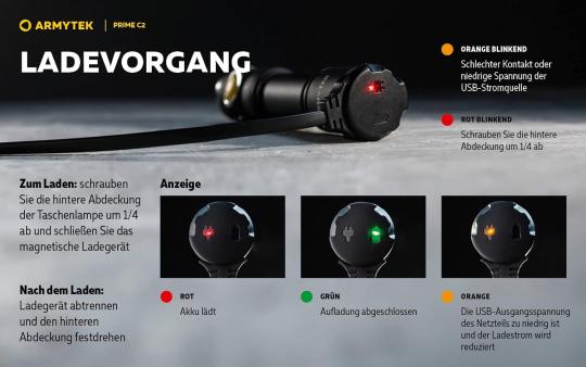 - Bei einer Temperatur nahe +58 °C wird die Helligkeit verringert, was verhindert, dass Lampe und Akku zu heiß werden und auch die Diode Abnutzungserscheinungen zeigt.