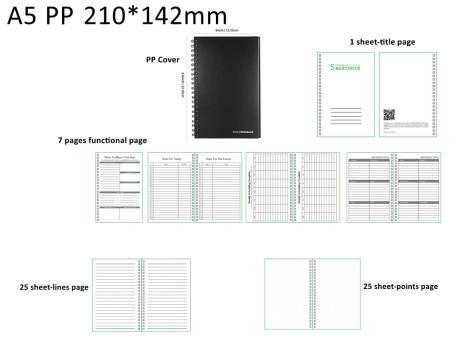 - Schreibblock mit 100 Schreibseiten, linierten 25 Blättern und 25 Blättern im Rasterformat, mit Seiten für Planung von Jahresplaner, Wochenplaner, Tagesplaner. Geliefert werden ein Stift, farbige Haftnotizen und ein Mikrofaser Tuch um die Notizen wieder zu löschen.