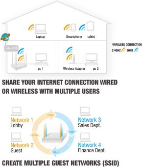 - Holen Sie sich die höchstmögliche drahtlose Netzwerkgeschwindigkeit mit dem EM4510 Dualband-Router AC1200. Der EM4510 ist mit vier Antennen ausgerüstet und teilt Ihren Internetanschluss mit höchster Geschwindigkeit. Verwenden Sie das 2,4 GHz- und das 5 GHz-Band gleichzeitig, um den Durchsatz zu maximieren und Interferenzen zu vermeiden. Das AC WiFi-Netzwerk ist perfekt für Online-Spiele und die Übertragung von Musik, Videos und Fotos. Dank des Gigabit-WAN-Ports ist dieser Router ideal für Hochgeschwindigkeitskabel- und Glasfaser-Internet. Mit all diesen Funktionen gestattet der EM4510 Dualband-Router AC1200 Ihnen Gastnetzwerke zu erstellen, und Sie können Ihren Internetanschluss mit Ihrer Familie und Ihren Freunden teilen. Die Servicequalität (QoS) stellt Ihren Netzwerkverkehr in den Vordergrund, z.B. Anwendungen und/oder Datenflüsse, um sie mit einer größeren Bandbreite zu versorgen.