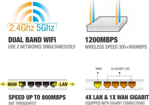 - Ports: Vier Gigabit-LAN-Ports, 1 Gigabit-WAN-Port