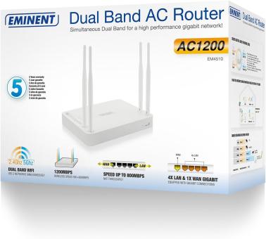 - Der Eminent EM4510 Dualband-Router AC1200 ist rückwärtig mit anderen drahtlosen 802.11 b/g/n-Geräten und standardmäßig mit verdrahteten Netzwerken, die mit 10/100Mbit arbeiten, kompatibel. Um eine maximale Geschwindigkeit zu erreichen, empfehlen wir, drahtlose Netzwerk-Adapter und/oder Gigabit-Netzwerk-Adapter von Eminent zu verwenden.