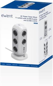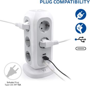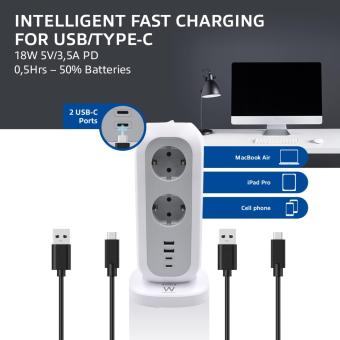 - 11 Schuko-Steckdosen zur Stromversorgung von 11 verschiedenen Elektrogeräten. 2 USB Typ A Ports und 2 USB Typ C Ports (5V / 3,5A PD) zum Laden der modernsten und aktuellsten Tablets / Smartphones und elektronischen Geräte