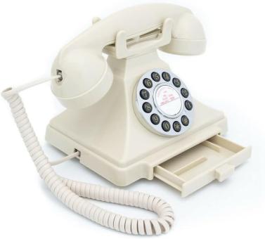 - Hinter dem klassischen Retro Design des Telefons verbirgt sich modernste Technik. Das Telefon ist aus hochwertig fester Qualität (Kunststoff) gefertigt und wird per Tastendruck bedient. Das eingebaute Notizbuch sorgt für Ihren Komfort. Ddas Telefon funktioniert auf jedem Analogen- Telefonanschluss.