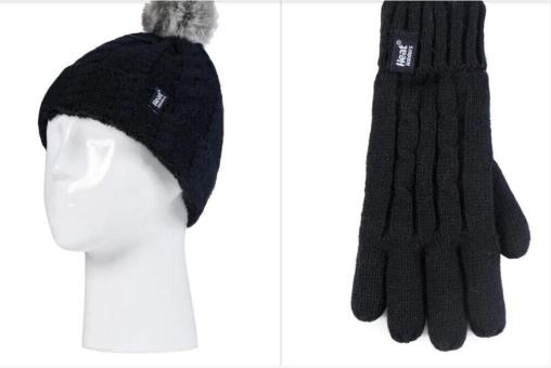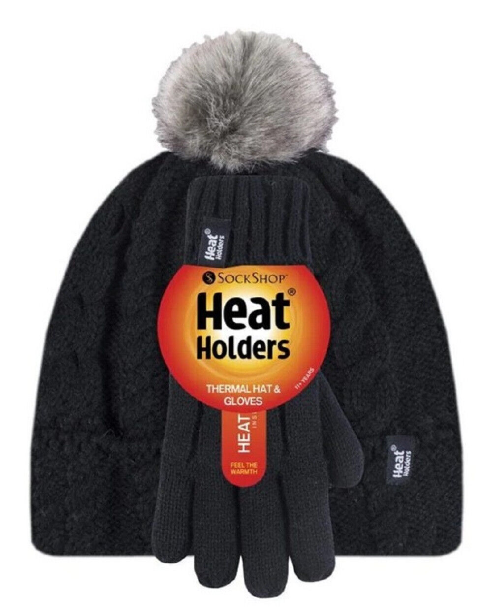 - Diese schöne Heat Holders-Mütze mit Bommel und Handschuh Set sind aus einem attraktiven, weichen Garn mit geripptem Saum gestrickt und enthalten das neueste HeatWeaver®-Thermofutter, ein luxuriöses, plüschähnliches Isoliergewebe, das die Menge an warmer Luft maximiert, die nahe an der Haut gehalten wird.