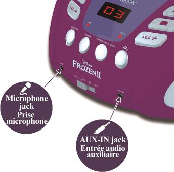- Mikrofonbuchse (Mikrofon nicht im Lieferumfang enthalten), um sie in Karaoke zu verwandeln und mit den Heldinnen von Frozen!