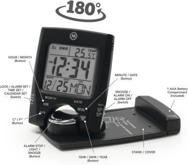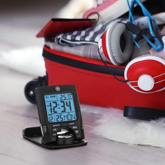 - EINGEBAUTER STÄNDER: Zusammenklappbarer Reisewecker mit um 180 Grad drehbarem Ziffernblatt.