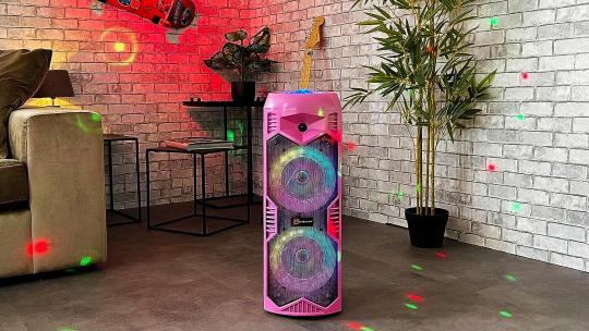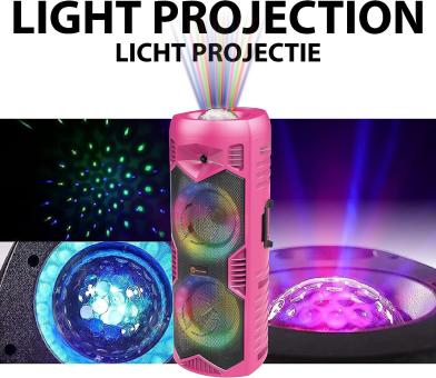 - Um die Party komplett zu machen, haben wir diesen Lautsprecher mit Projektions- und LED-Lichtern ausgestattet.