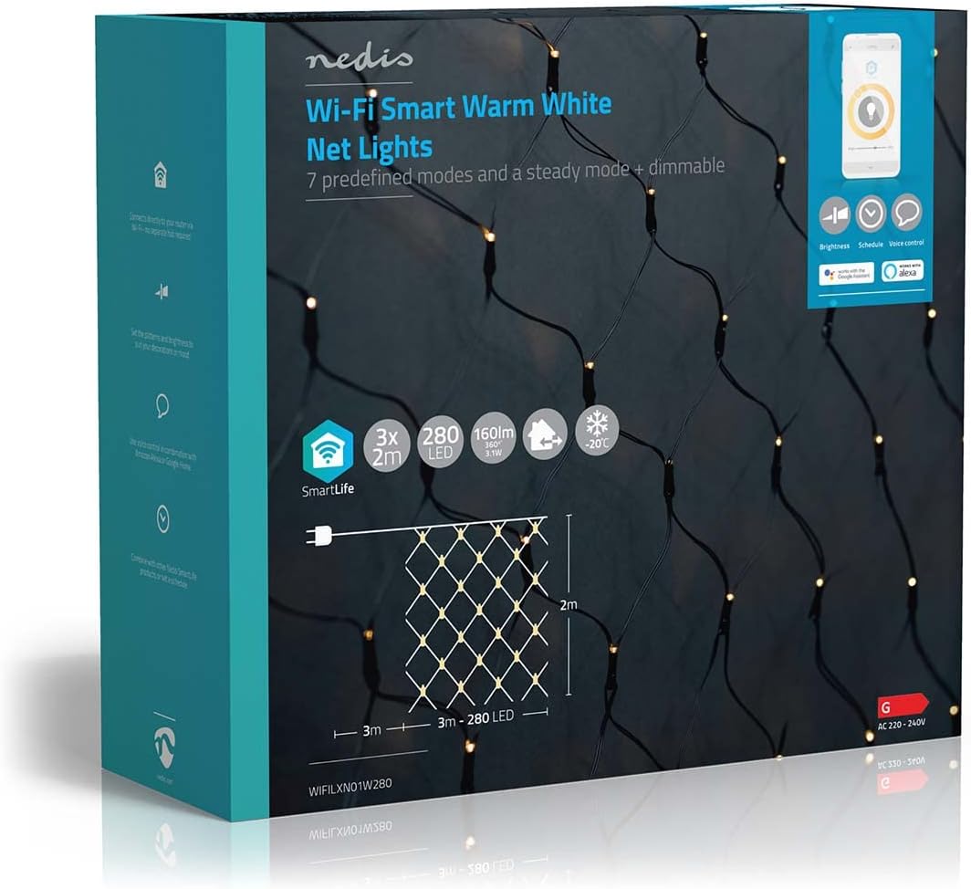 - Dieses benutzerfreundliche Nedis WLAN-Smart-Netz mit 280 warmweißen LEDs und einer Abmessung von 3 x 2 Metern versetzt ganz einfach (mehrere) Sträucher, Fassaden, Decken oder Gegenstände in eine magische Atmosphäre. Dank fortschrittlicher Smart-Technologie wird Ihre Dekoration auf einen höheren Standard gebracht. Neben der bevorzugten Helligkeit können Sie auch einen der 7 vordefinierten Effekte mit verschiedenen Bewegungsmustern oder den Dauerlicht-Modus in der App auswählen.