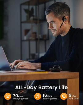 - Bis zu 70 Stunden Wiedergabezeit (Headset: ca. 9 Stunden Gespräche, ca. 16 Stunden Musikwiedergabe / inklusive Nachladen mit Ladeetui bis zu 48 Stunden Gespräche, 70 Stunden Msuikwiedergabe)