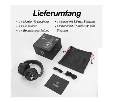 • Im Lieferumfang enthalten: OneOdio Monitor 40 Kopfhörer in Schwarz, Aufbewahrungsbehälter für sichere Aufbewahrung, Benutzerhandbuch für einfache Einrichtung und Verwendung, 3,5-mm-Kabel mit Mikrofon (1,2 m) für den Anschluss an verschiedene Geräte, 3,5-mm-auf-6,35-mm-Kabel (2~3 m) für professionelle Audioanwendungen
