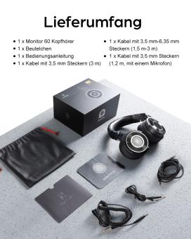 - Das Monitor 60 DJ Headset enthält ein 1.2 m langes Kabel mit Mikrofon für Telefongespräche, ein 3.5mm auf 6.35mm Adapterkabel für den Einsatz im Studio (besondere zum Abhören und Abmischen)