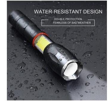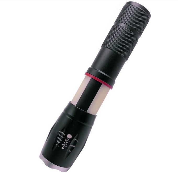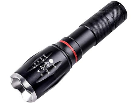 - Aluminium-LED-Taschenlampe mit einstellbarem Lichtfokus (Zoomfunktion) und einer zusätzlichen Nachtlampe und Powerbank.