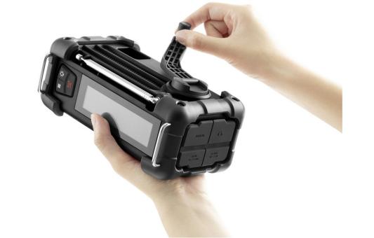 • Stromversorgung durch Handkurbel/Solarstrom/DC-In (USB Typ-C) an wiederaufladbare Lithiumbatterie