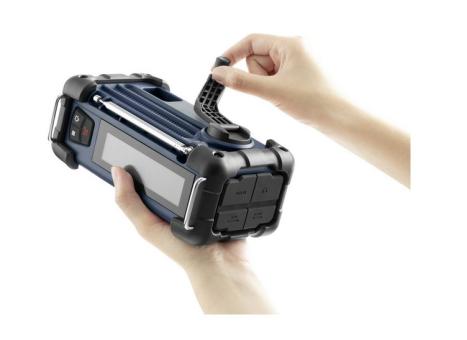 - Stromversorgung durch Handkurbel/Solarstrom/DC-In (USB Typ-C) an wiederaufladbare Lithiumbatterie