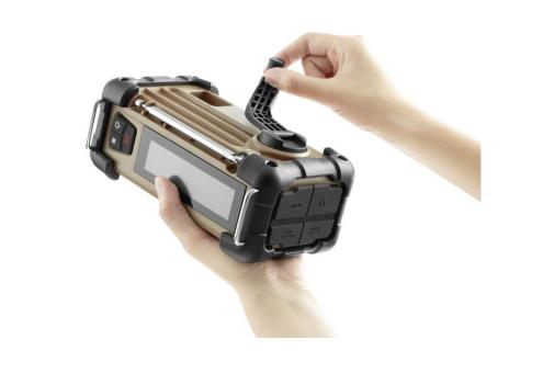 - Stromversorgung durch Handkurbel/Solarstrom/DC-In (USB Typ-C) an wiederaufladbare Lithiumbatterie