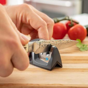 - Diamantbeschichtete Stäbe und gekreuzte Keramikklingen verfügen über voreingestellte Schärfwinkel, die jedes Mal den richtigen Schärfwinkel bieten.