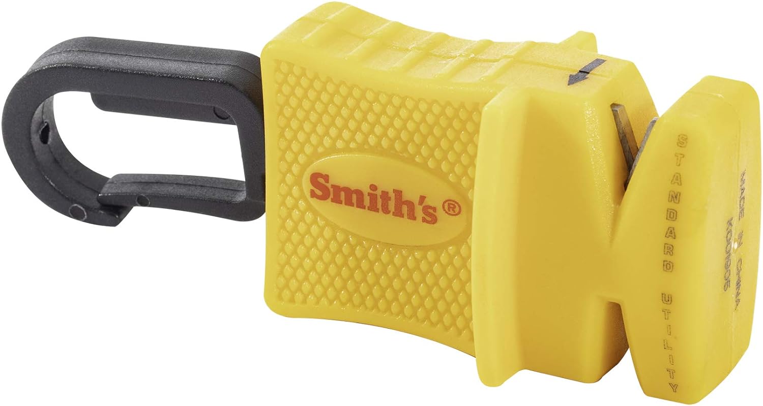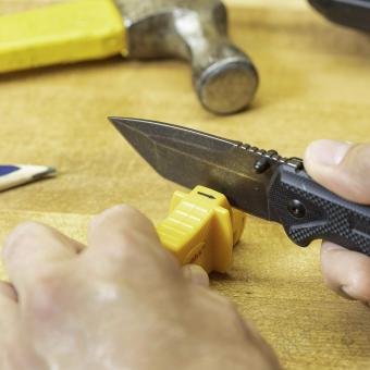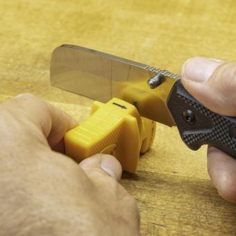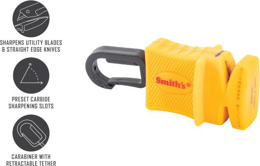 - Der Allzweckmesserschärfer EdgeWork-Site von Smith verfügt über zwei voreingestellte Schlitze, die mit Hartmetallklingen ausgestattet sind.