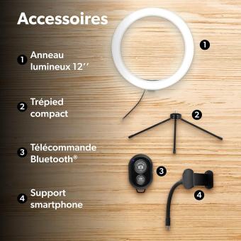 - Die Halterung für das Smartphone ist flexibel und somit für einen optimalen Einsatz verstellbar. Außerdem befindet sich die Halterung in der Mitte des Rings. Das Licht wird also gleichmäßig um das Smartphone herum abgestrahlt, wodurch aus jedem Winkel eine gepflegte und ausgewogene Helligkeit erzielt wird. Der Lichtring verfügt über einen im USB-Kabel enthaltenen Controller, mit dem Sie das Gerät ein- und ausschalten, zwischen den drei Lichtoptionen (warmes, mittleres, kaltes Licht) navigieren und die Helligkeitsstufe einstellen können. Eine Bluetooth-Fernbedienung ist im Lieferumfang enthalten, mit der Sie Ihr Smartphone steuern und Fotos aus der Ferne aufnehmen können. Der Ring wird über das mitgelieferte USD-Kabel mit Strom versorgt.