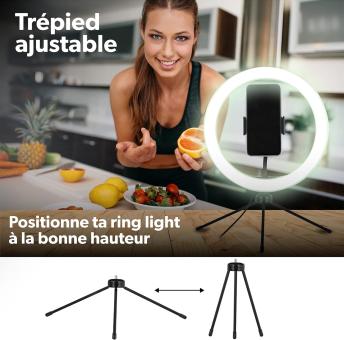- Smartphone-Halterung, das Ringlicht ist mit einer Smartphone-Halterung ausgestattet, um Ihr Telefon zu befestigen; es ist flexibel und daher einstellbar, um eine optimale Position zu haben; Darüber hinaus ist die Halterung in der Mitte des Rings platziert; Dadurch wird das Licht gleichmäßig rund um das Objektiv abgegeben, was eine klare und ausgewogene Helligkeit in allen Winkeln ermöglicht