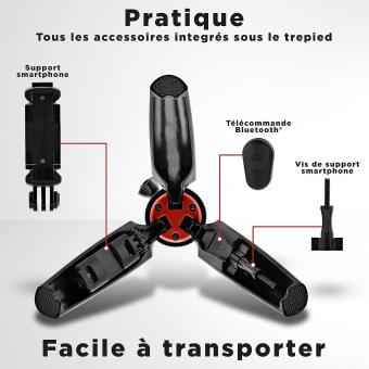 - Das eingebaute Stativ ist mit Smartphones, Kompaktkameras und Sportkameras kompatibel und somit äußerst vielseitig.