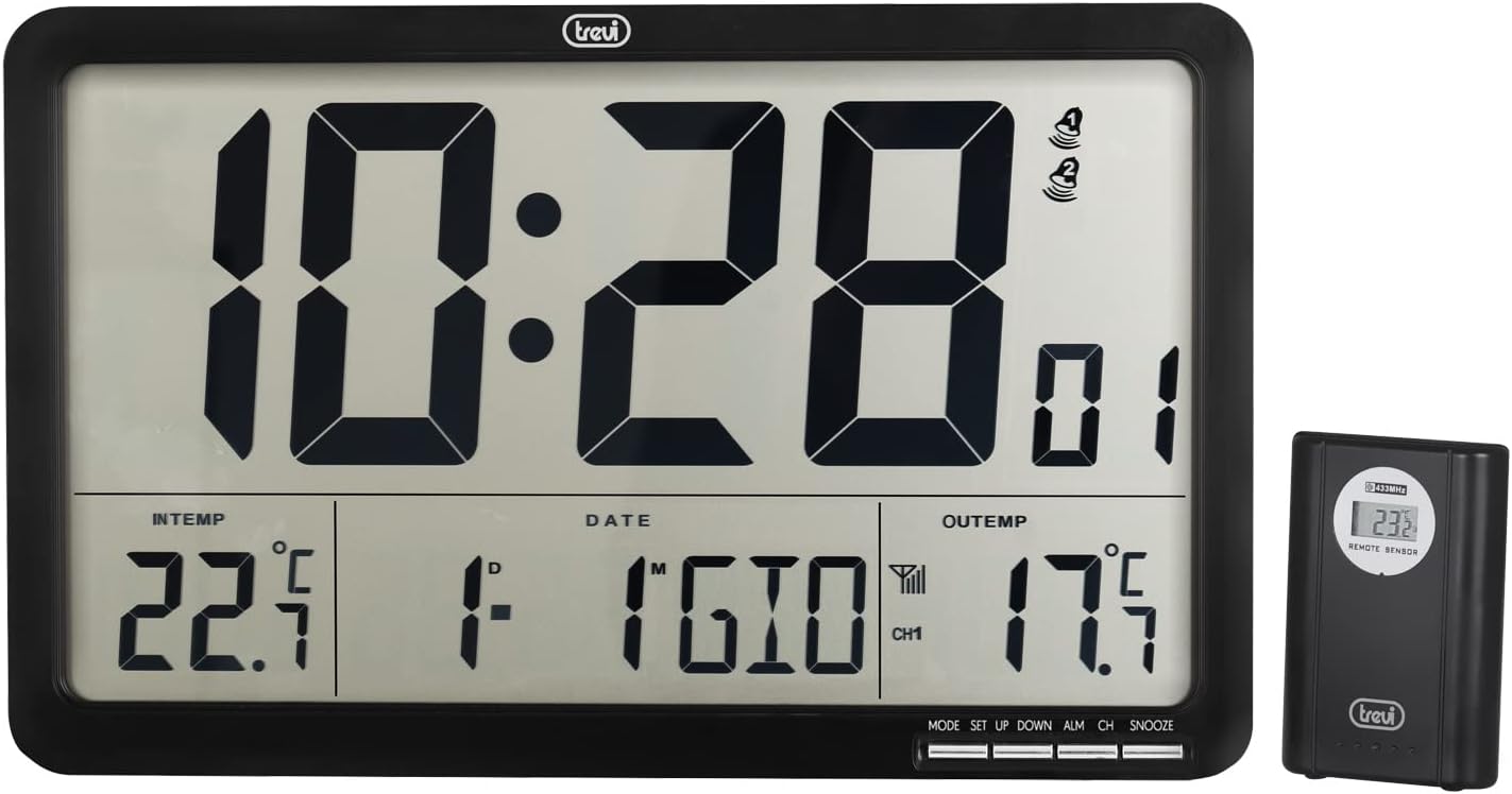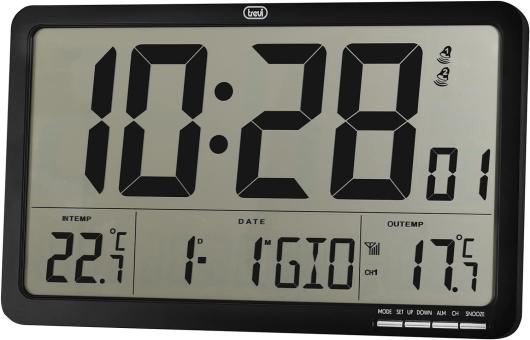 - Die digitale Funk-Wanduhr Trevi OM 3560 RC ist ein modernes Design, das eine große Anzahl von Zeit- und Wetterinformationen immer klar und sichtbar bietet.